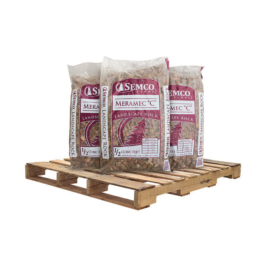 Meramec C is a neutral colored naturally rounded pebble with a variety of brown and tan colored rocks. Sold in a 0.5 cu-ft bag and in bulk. Average size is 3/4 to 1 in.