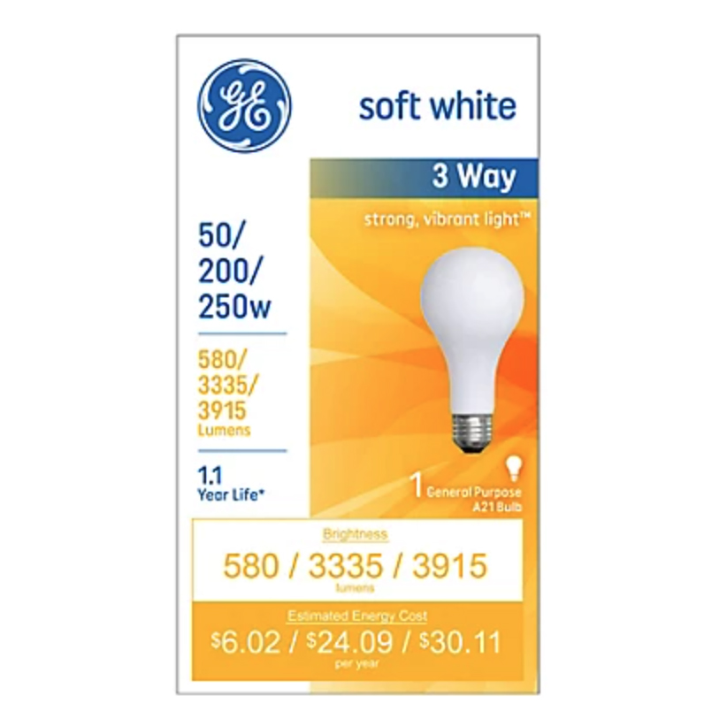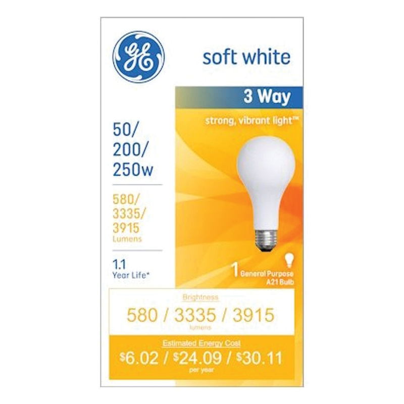 GE Light Bulb, Three-Way, Wattage Rating: 250 W, 120 V, Lamp Shape: A21, Lamp Base: E26 Medium, Lamp Material: Glass, Lumens: 3915 Lumens, Dimmable: Yes, Light Color: Soft White, Color Temperature: 2800 K, Average Life: 1200 hr, Dimensions: 2-5/8 in Dia x 5-1/4 in L
